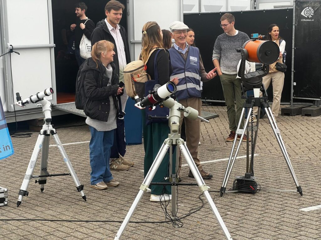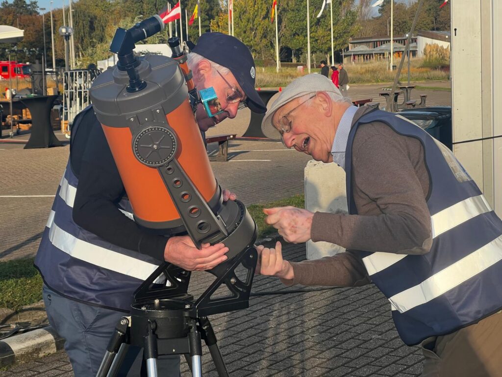 Buiten liet de zon zich helaas maar zelden zien – maar dat hield de nieuwsgierigen niet tegen. “Er kwamen veel kinderen vragen wat er dan wél te zien was, en natuurlijk werd er enthousiast aan knoppen gedraaid,” vertelt bestuurslid en ervaren telescoopbeheerder Martien Jacobs. “Een paar bezoekers die net een telescoop hadden gekocht, kregen meteen uitleg over het gebruik. En wie er niet uitkwam, mag met de telescoop langskomen voor extra hulp.”
