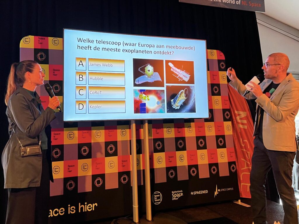 Sarah Praal presenteerde een vraag die de KNVWS had ingebracht in de publieksquiz van ESA. Onze vraag ging over Europese ruimtetelescopen; Sarah legde de link met ‘aardse sterrenkunde’ en hoe je ook in Nederland – ondanks het wisselvallige weer en kleinere telescopen – toch een indrukwekkende ruimte-ervaring kunt hebben bij een van onze sterrenkundige verenigingen. Een mooie gelegenheid om het publiek te laten zien hoe professioneel en inspirerend de amateursterrenkunde in Nederland is.