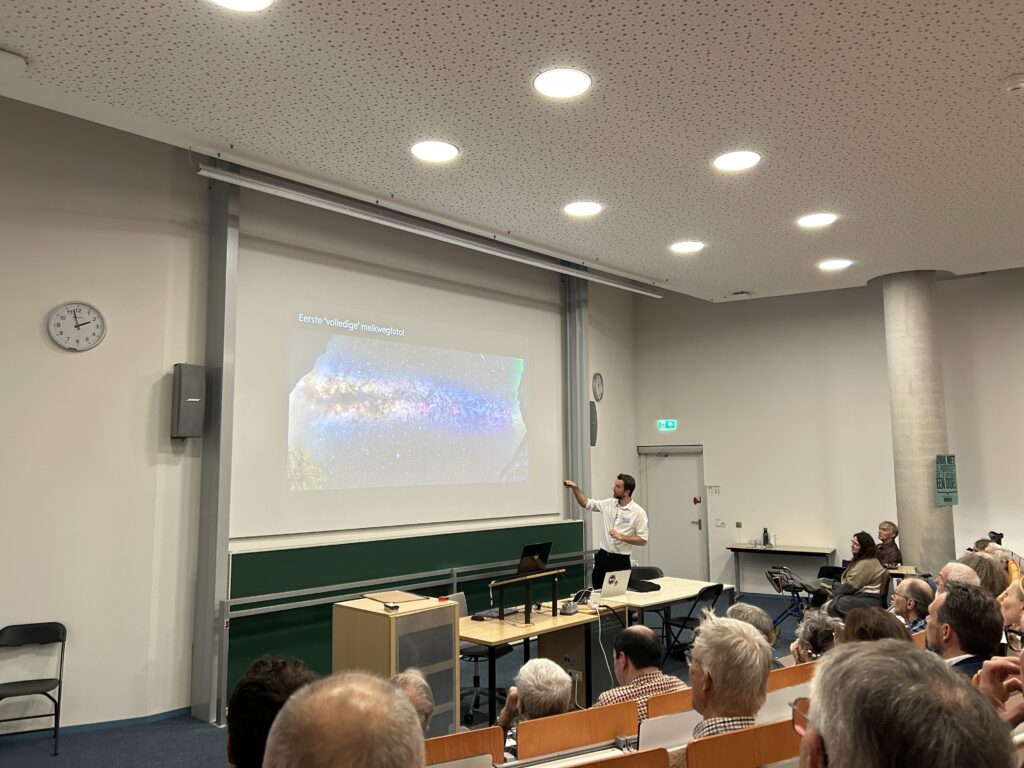 In zijn lezing voegde Bowen de daad bij het woord. Hij nam het publiek mee van zijn eerste opnames in de achtertuin tot geavanceerde deep-sky-projecten. Ervaren astrofotografen keken ademloos toe; af en toe klonk een fluistering: “Dit lukt mij nooit.” Na afloop verzamelde zich een kring van bewonderaars om hem heen, in levendige technische discussie – een spontane demonstratie van de verbinding tussen jong en oud, precies waar de Van Woerdenprijs voor bedoeld is.