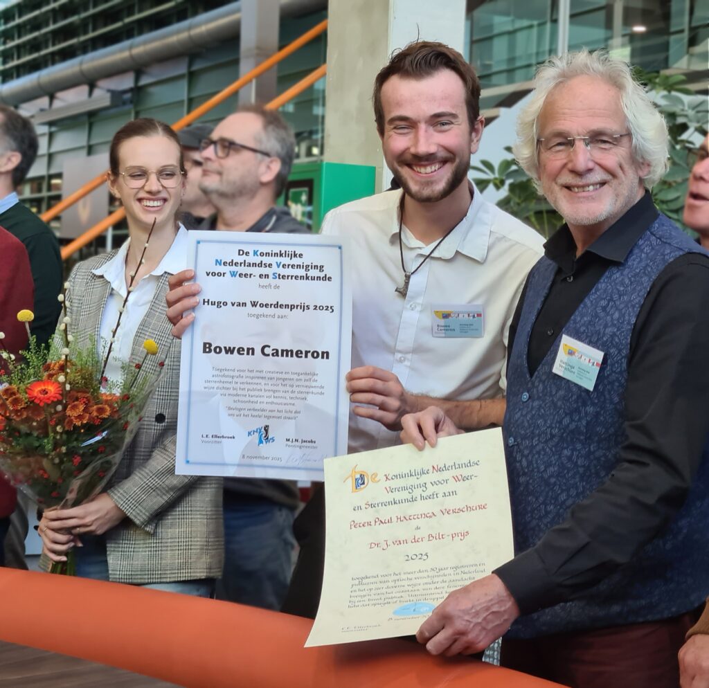De tweede laureaat, Bowen Cameron (23), ontving de Hugo van Woerdenprijs. Cameron vertegenwoordigt een andere vorm van waarnemen: de kunst van de astrofotografie. Hij studeert Earth Sciences aan de UvA na een bachelor Sterrenkunde in Leiden. Zijn interesses liggen op het snijvlak van planetaire wetenschap, remote sensing en ruimteverkenning. Tijdens een stage bij EuroMoonMars werkte hij mee aan een CubeSat-project voor analyse van het maanoppervlak.